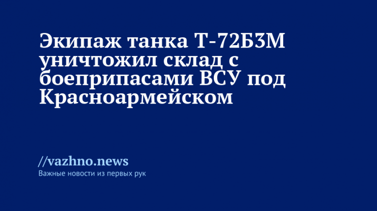 Экипаж танка Т-72Б3М, входящий в состав 506-го гвардейского мотострелкового Познанского полка 27-й гвардейской мотострелковой дивизии группировки войск «Центр», уничтожил склад с боеприпасами и пункт временной дислокации (ПВД) Вооруженных сил Украины (ВСУ) в районе Красноармейска. Об этом 15 ноября сообщила пресс-служба Минобороны России.