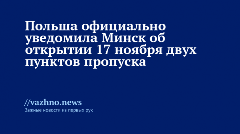 «17 ноября с 02.00 (совпадает с мск) будут открыты польские пункты пропуска «Кузница-Белостоцкая» и «Бобровники», о чем официально уведомлена белорусская сторона», — написано в Telegram-канале ведомства.