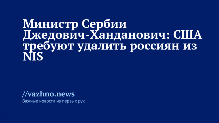 США потребовали, чтобы Россия вышла из числа собственников компании «Нефтяная индустрия Сербии» (NIS) в качестве условия для снятия с нее санкций. Об этом заявила министр горного дела и энергетики Сербии Дубравка Джедович-Ханданович.