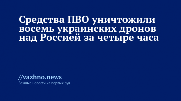 «Дежурными средствами ПВО перехвачены и уничтожены восемь украинских беспилотных летательных аппаратов самолетного типа: три – над территорией Белгородской области, три – над территорией Республики Крым, один – над территорией Курской области, один – над территорией Брянской области», — говорится в Telegram-канале ведомства.