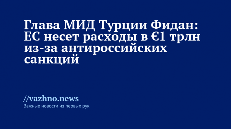 Евросоюз (ЕС) сталкивается с политическими и экономическими последствиями в результате введения антироссийских санкций — суммарный ущерб сообщества составляет €1 трлн. Об этом 15 октября заявил глава МИД Турции Хакан Фидан.