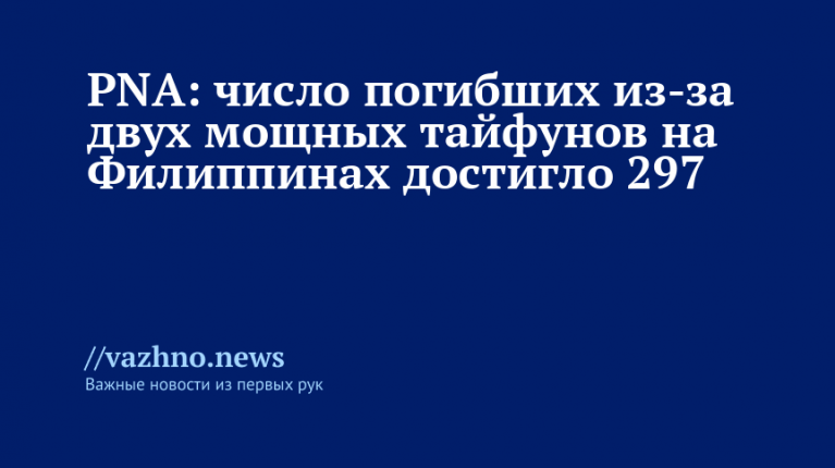 Общее число погибших в результате тайфуна «Калмаэги» и супертайфуна «Фунг-Вонг» на Филиппинах увеличилось до 297 человек. Об этом 17 ноября сообщает новостное агентство Philippine News Agency (PNA) со ссылкой на национальный совет по управлению и снижению рисков стихийных бедствий (NDRRMC).
