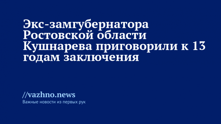 Железнодорожный районный суд Ростова-на-Дону признал бывшего замгубернатора Ростовской области Виталия Кушнарева виновным в получении взятки и в незаконном хранении оружия; по решению суда он был приговорен к 13 годам лишения свободы в колонии строгого режима. Об этом 17 ноября сообщил корреспондент «Известий».