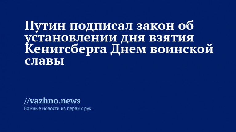 Президент России Владимир Путин утвердил закон, вводящий новую памятную дату — 9 апреля, День героического штурма и взятия Кенигсберга. Соответствующий нормативный акт был обнародован 17 ноября на официальном интернет-портале правовой информации.