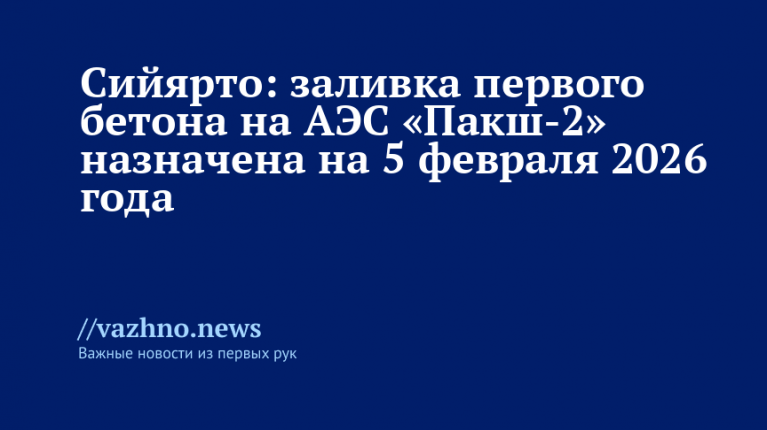 Петер Сийярто, министр иностранных дел и внешнеэкономических связей Венгрии, 18 ноября заявил, что заливка «первого бетона» для сооружения атомной электростанции (АЭС) «Пакш-2» в Венгрии намечена на 5 февраля 2026 года и для этого уже получены все необходимые разрешения.