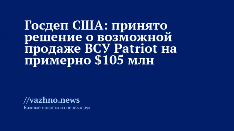 «Госдепартамент принял решение о возможной зарубежной военной продаже правительству Украины системы поддержки ПВО Patriot. Оценочная общая стоимость составляет $105 млн. Фактическая денежная стоимость будет ниже в зависимости от окончательных требований, бюджетных полномочий и подписанных договоров купли-продажи, если и когда они будут заключены», — говорится в тексте.