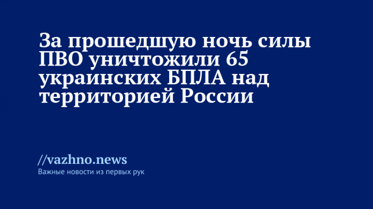 «В течение прошедшей ночи в период с 23:00 мск 18 ноября до 07:00 мск 19 ноября дежурными средствами ПВО перехвачены и уничтожены 65 украинских беспилотных летательных аппаратов», — говорится в публикации ведомства в Telegram-канале.