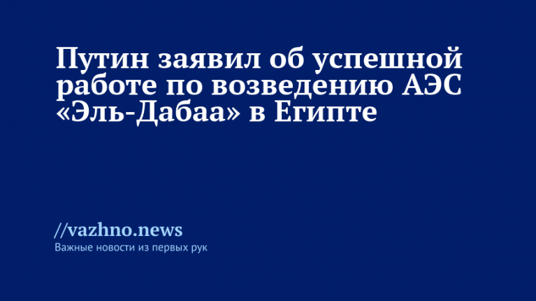 «Возведение при российском участии первой в Египте АЭС продвигается успешно. По сути мы переходим на ключевой этап технологического оснащения станции. И уже в обозримом будущем она сможет начать выработку электроэнергии», — заявил российский лидер.