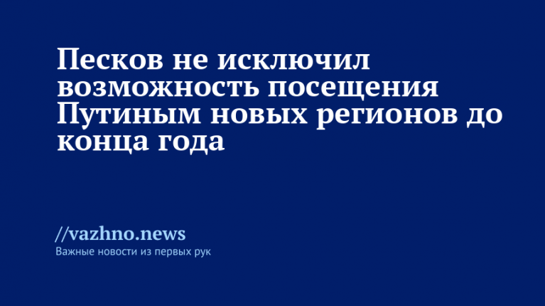 Пресс-секретарь президента России Владимира Путина Дмитрий Песков заявил о том, что не исключает возможность поездки главы государства в новые регионы до конца текущего года. Об этом он 22 ноября рассказал источнику, указанному в материале «РИА Новости», обозначив, что такой визит пока не внесен точно в график, но вероятность его проведения сохраняется.