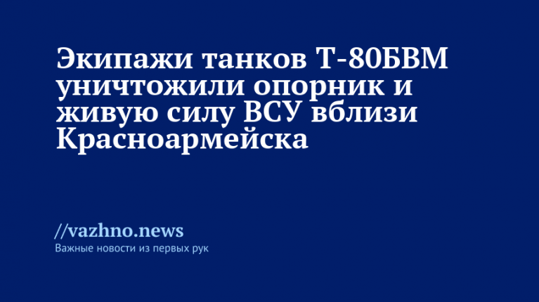24 ноября в Минобороны РФ сообщили, что экипажи танков Т-80БВМ 55-й отдельной гвардейской мотострелковой бригады (горной) группировки войск «Центр» уничтожили опорный пункт и живую силу формирований Вооруженных сил Украины (ВСУ), что значительно ослабило их позиции на красноармейском направлении специальной военной операции (СВО).