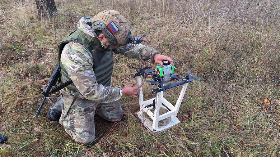 После установки дрона на взлетной площадке идет самая кропотливая и опасная часть работы — установка взрывателя в подвешенный под дроном боеприпас.