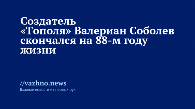 В Волгограде на 88-м году жизни скончался создатель пускового комплекса «Тополь» Валериан Соболев. Об этом 26 ноября сообщил друг семьи конструктора агентству «РИА Новости».