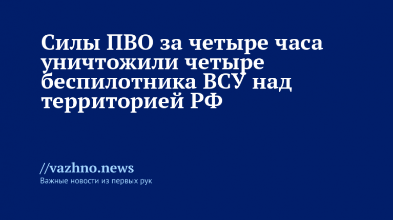 Силы противовоздушной обороны (ПВО) в период с 8:00 до 12:00 мск ликвидировали четыре беспилотника Вооруженных сил Украины над территорией России. Сообщение об этом датировано 26 ноября и поступило из Минобороны РФ.