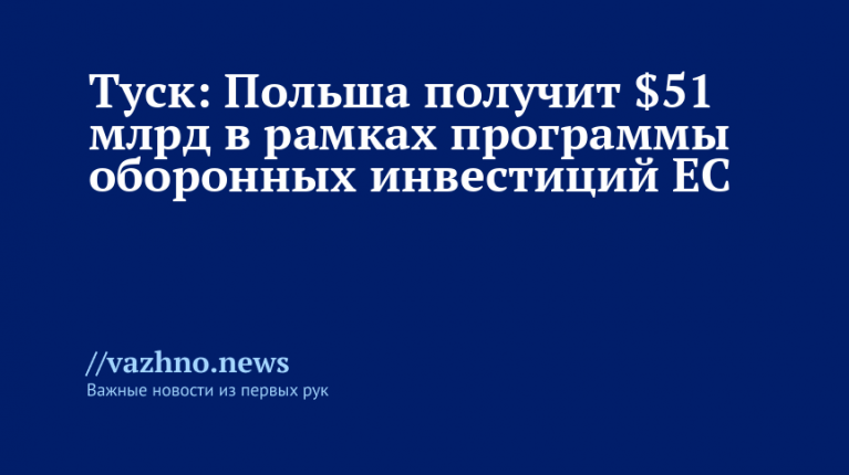 «Польша получит €44 млрд ($50,91 млрд) по программе Европейского союза SAFE на усиление своих вооруженных сил», — передает слова Туска агентство Reuters.