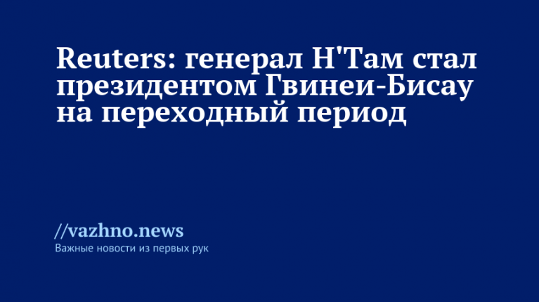 Президентом Гвинеи-Бисау на переходный период стал генерал Орта Н'Там. Об этом 27 ноября сообщает агентство Reuters.«Н'Там был приведен к присяге в качестве временного президента Гвинеи-Бисау», — говорится в заявлении военных.Отмечается, что срок переходного периода составляет один год. Накануне военнослужащие в Гвинее-Бисау объявили о закрытии всех границ страны. Кроме того, они заявили, что всё государство находится под их полным контролем, и сообщили, что «приостанавливают избирательный процесс» в Гвинее-Бисау.Посольство России в стране на фоне сложившейся ситуации привели в состояние повышенной готовности. Позднее там сообщили, что ситуация в стране нормализовалась.В этот же день официальный представитель МИД РФ Мария Захарова заявила, что Москва обеспокоена в связи с ситуацией в Гвинее-Бисау, следит за происходящими там событиями и призывает политические силы проявить сдержанность. Дипломат также призвала стороны приложить все необходимые усилия для стабилизации ситуации, соблюдать порядок и действовать в рамках закона.