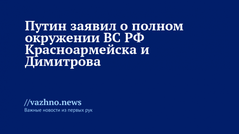«Красноармейск и Димитров полностью окружены. Также, как в свое время Купянск. 70% территории Красноармейска находится в руках российских Вооруженных сил. На юге города Димитрова группировка противника отсечена, она рассекается по всему городу и наши войска переходят к ее планомерному уничтожению», — отметил президент.