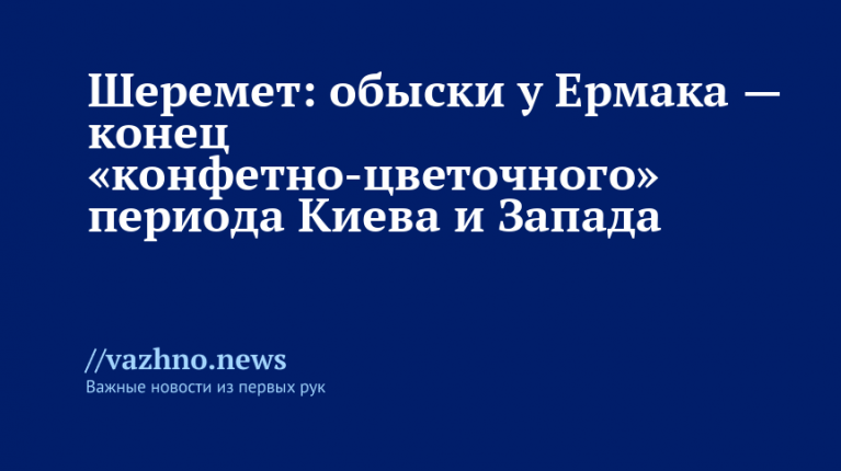 Обыски в доме у главы офиса президента Украины Владимира Зеленского Андрея Ермака ознаменовали конец «конфетно-цветочного» периода в отношениях Киева с Западом. Об этом 28 ноября заявил депутат Государственной думы (ГД) от Крыма Михаил Шеремет.