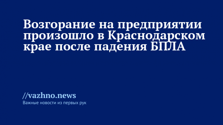 В Краснодарском крае в результате падения беспилотного летательного аппарата (БПЛА) произошел пожар на территории подсобного хозяйства сельскохозяйственного предприятия в поселке городского типа Афипский. Об этом 29 ноября сообщает Оперативный штаб по региону в Telegram-канале.