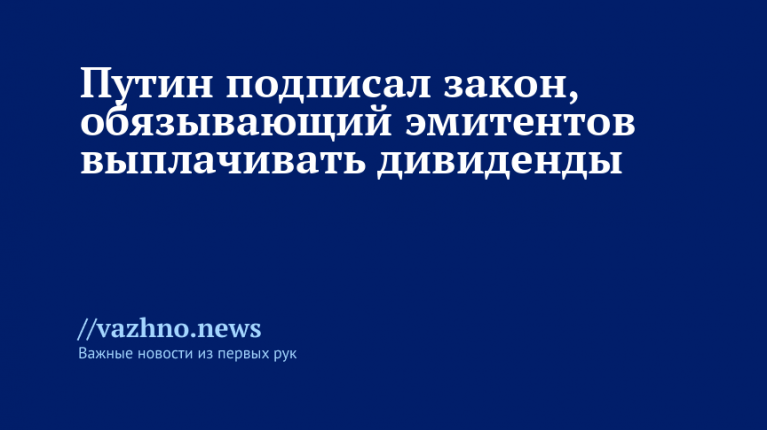 Президент России Владимир Путин подписал закон, который обязывает российских эмитентов выплачивать дивиденды как акционерам, так и держателям депозитарных расписок. Об этом 28 ноября сообщили на официальном интернет-портале правовой информации.