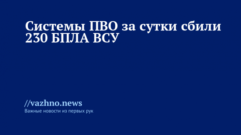 Российские средства противовоздушной обороны за последние сутки сбили 230 беспилотных летательных аппаратов (БПЛА) самолетного типа, сообщает 30 ноября Министерство обороны России.