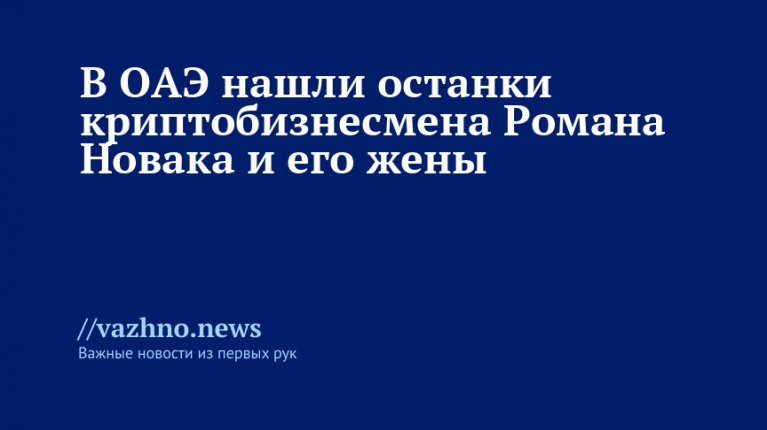 В Объединенных Арабских Эмиратах (ОАЭ) обнаружили тела криптобизнесмена Романа Новака и его супруги Анны. Об этом сообщил 1 декабря телеканал 78.ru в Telegram-канале.Уточняется, что останки были найдены в пустыне, на пустыре. Обнаружили их около двух недель назад.Телеканал 78.ru 7 ноября сообщил, что супружескую пару убили в ОАЭ. Семью похитили с целью вымогательства, а когда не получили выкуп, с парой расправились. Следственный комитет России (СК РФ) возбудил уголовное дело по факту безвестного исчезновения семейной пары. Все трое подозреваемых по делу об убийстве были арестованы, они оказались россиянами. Один из мужчин — Константин Ш., в 2010 году был осужден на 15 лет за сбыт наркотических веществ.Позднее официальный представитель МВД РФ Ирина Волк сообщила, что причиной похищения в ОАЭ семьи из Петербурга стало вымогательство криптовалюты. Уточнялось, что преступники арендовали автомобили и помещения для удержания заложников.Росгвардия Краснодарского края 7 ноября опубликовала видео задержания одного из участников преступной группы, подозреваемого в убийстве криптомошенника.8 ноября стало известно, что Новак числился должником в России на сумму свыше 6,4 млн рублей. В отношении него было открыто девять исполнительных производств. Несколько из них впоследствии прекращены на основании ст. 46 ч.1 п. 3 и 4 закона «Об исполнительном производстве».Все важные новости — в канале «Известия» в мессенджере МАХ