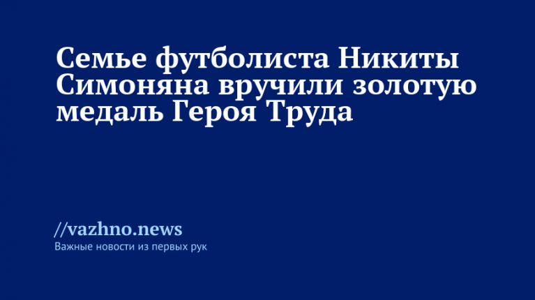 Семье футболиста Никиты Симоняна вручили золотую медаль Героя Труда