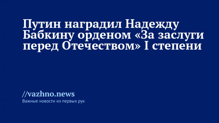«Наградить орденом «За заслуги перед Отечеством» І степени Бабкину Надежду Георгиевну — художественного руководителя — директора государственного бюджетного учреждения культуры города Москвы «Московский государственный академический театр «Русская песня», — говорится в тексте документа.