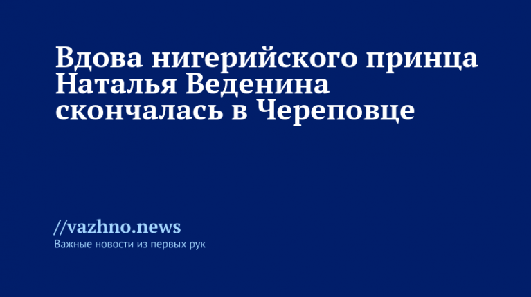 Вдова нигерийского принца, участница шоу «Малахов» Наталья Веденина скончалась в Череповце на 59-м году жизни из‑за остановки сердца. Об этом в эфире телешоу сообщили 2 декабря.