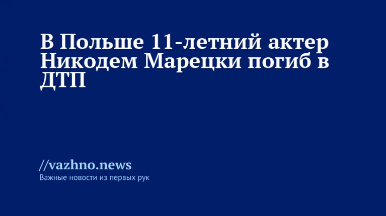 Польский юный актер Никодем Марецки погиб в результате дорожно-транспортного происшествия в возрасте 11 лет. Об этом 2 декабря сообщил телеканал Polsat News, ссылаясь на заявление родителей мальчика.