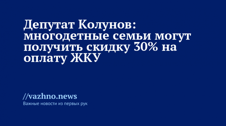 Многодетные семьи в России могут рассчитывать на скидку при оплате жилищно-коммунальных услуг в размере не менее 30%. Об этом 3 декабря заявил зампредседателя комитета Госдумы по строительству и ЖКХ Сергей Колунов.