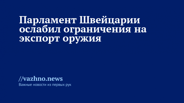 В июне Совет кантонов Швейцарии поддержал отмену запрета на реэкспорт вооружения в зоны военных конфликтов. По условиям этого решения, Швейцария получит возможность поставлять оружие странам НАТО, за исключением чрезвычайных ситуаций и случаев, когда такие поставки будут «противоречить внешнеполитическим или политическим интересам» государства.