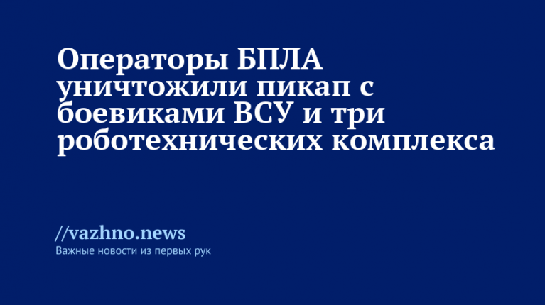Во время выполнения воздушной разведки и патрулирования в районе населенного пункта Константиновка операторы ударных БПЛА заметили и ликвидировали пикап, в котором находились украинские военнослужащие. В последующем наблюдении были обнаружены ещё три наземных робототехнических комплекса, которые, пытаясь доставить боеприпасы и продовольствие на передовые позиции ВСУ, также были уничтожены.