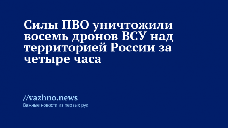 В сообщении ведомства отмечается: «В период с 16:00 до 20:00 мск дежурными средствами ПВО перехвачены и уничтожены восемь украинских беспилотных летательных аппаратов самолетного типа», — написали в Telegram-канале ведомства.