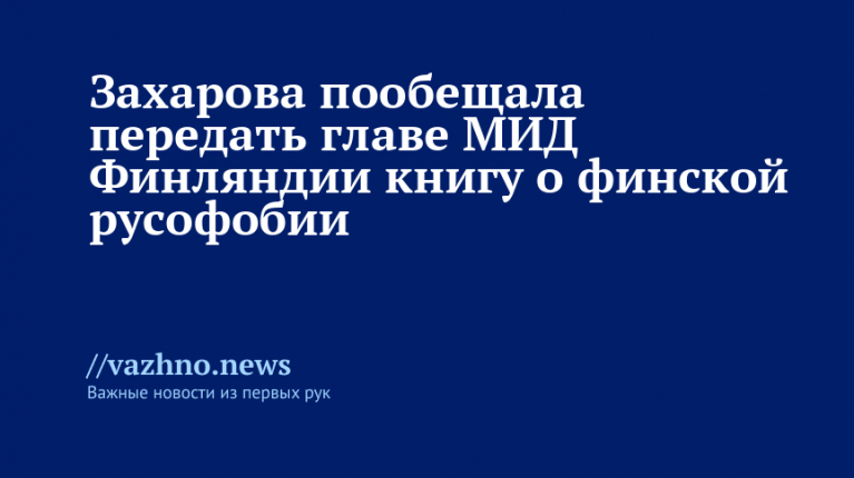 Официальный представитель МИД России Мария Захарова сообщила, что намерена вручить главе финского внешнеполитического ведомства Элине Валтонен книгу о финской русофобии и агрессии против Советской России. Об этом она написала 9 декабря в своем Telegram-канале в ответ на слова Валтонен.