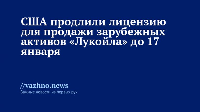 Министерство финансов США продлило действие лицензии, разрешающей проводить переговоры и подписывать условные контракты по продаже зарубежных активов нефтяной группы «Лукойл», до 17 января 2026 года. Соответствующий документ был опубликован 10 декабря на сайте Управления по контролю за иностранными активами (OFAC).