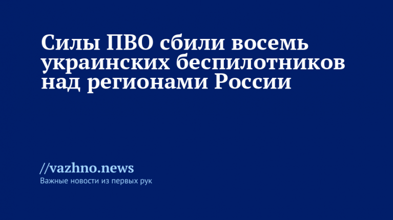Российские средства противовоздушной обороны (ПВО) за пять часов перехватили и уничтожили восемь украинских беспилотных летательных аппаратов над регионами России. Об этом говорится в сообщении Минобороны РФ.