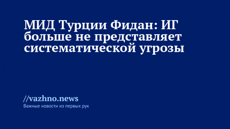 По словам министра иностранных дел Турции Хакан Фидан, высказанным 13 декабря в эфире телеканала TVNET на YouTube, террористическая организация «Исламское государство» ( ИГ, организация признана террористической и запрещена в РФ. — Ред.) уже не представляет собой систематическую угрозу.