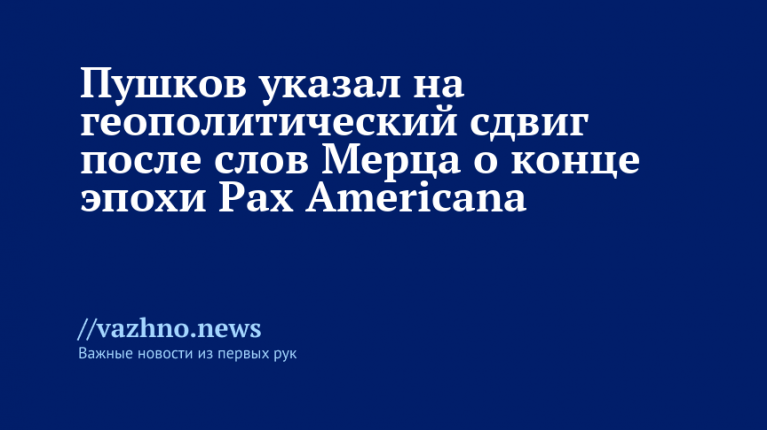 Сенатор Алексей Пушков в своем Telegram-канале 14 декабря сообщил, что слова канцлера ФРГ Фридриха Мерца о завершении эпохи Pax Americana для Европы указывают на значительный геополитический перелом.