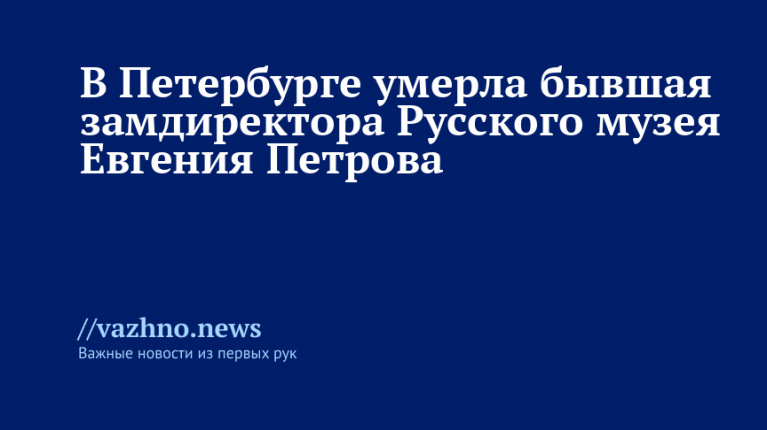 В Санкт-Петербурге на 80-м году жизни ушла из жизни бывшая заместитель генерального директора Русского музея по научной работе Евгения Петрова. Пресс-служба музея подтвердила эту информацию 14 декабря, сообщив о ее кончине.