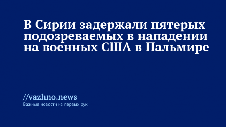 Правоохранительные органы Сирии 14 декабря сообщили о задержании пятерых человек, которых подозревают в нападении на военнослужащих США и сирийских сил в Пальмире. Об этом заявили в МВД республики.