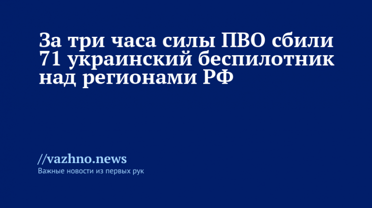 «В период с 20.00 мск до 23.00 мск дежурными средствами ПВО перехвачен и уничтожен 71 украинский беспилотный летательный аппарат самолетного типа», — сказано в канале ведомства в мессенджере Max.