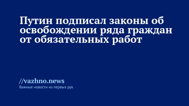 Президент России Владимир Путин утвердил пакет законов, вводящих дополнительные ограничения на назначение обязательных работ для отдельных категорий граждан. Соответствующий документ был размещен 15 декабря на официальном интернет-портале правовой информации.