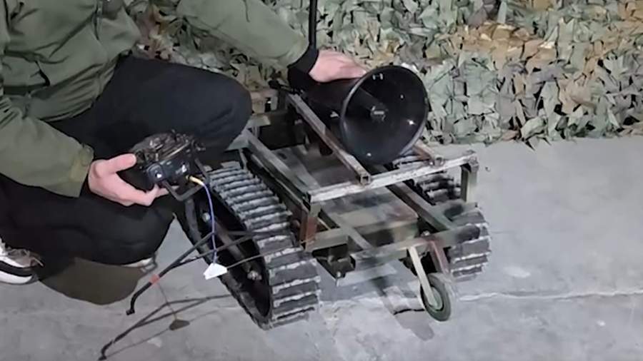 «Это, как бы парадоксально ни звучало, едва ли не самое грозное оружие в борьбе с неприятелем. Обычная роботизированная тележка, сделанная из подручных материалов: вешалка, металлические уголки, внутри установлен двигатель от шуруповерта, но самое главное, конечно, громкоговоритель», — рассказывает Кильдибеков.