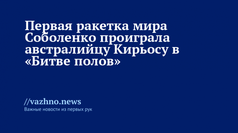 Арина Соболенко, занимающая первую строчку в рейтинге Женской теннисной ассоциации (WTA), уступила в выставочном поединке австралийцу Нику Кирьосу. Матч состоялся в Дубае и завершился с результатом 6:3, 6:3.