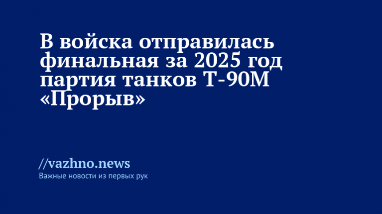 Концерн Уралвагонзавод (УВЗ) направил в Армию России финальную партию танков Т-90М «Прорыв» в рамках выполнения гособоронзаказа на 2025 год. Об этом 1 января сообщается в Telegram-канале компании.