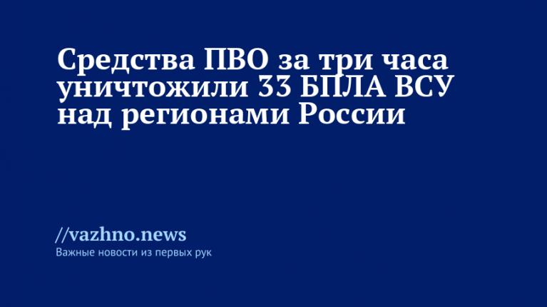 Средства противовоздушной обороны сообщили, что за три часа над регионами России было уничтожено 33 беспилотных летательных аппарата (БПЛА), которые, по данным ведомства, принадлежали Вооруженным силам Украины (ВСУ). Кто провел операцию — средства ПВО, что произошло — уничтожение 33 дронов, когда — в течение трех часов вечером, где — в небе над российскими регионами, как и почему — аппараты были перехвачены и уничтожены дежурными средствами ПВО.