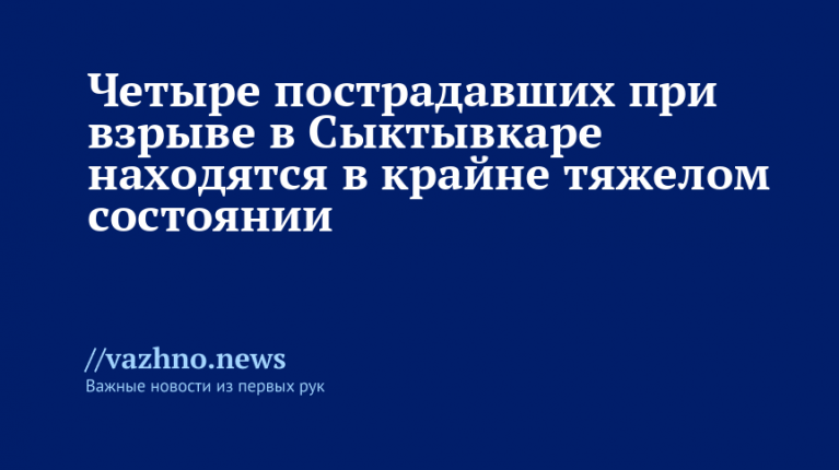 Министр здравоохранения Республики Коми Ирина Кондратьева 15 января сообщила, что четыре человека, получившие травмы при взрыве в Центре профессиональной подготовки МВД в Сыктывкаре, находятся в крайне тяжелом состоянии.