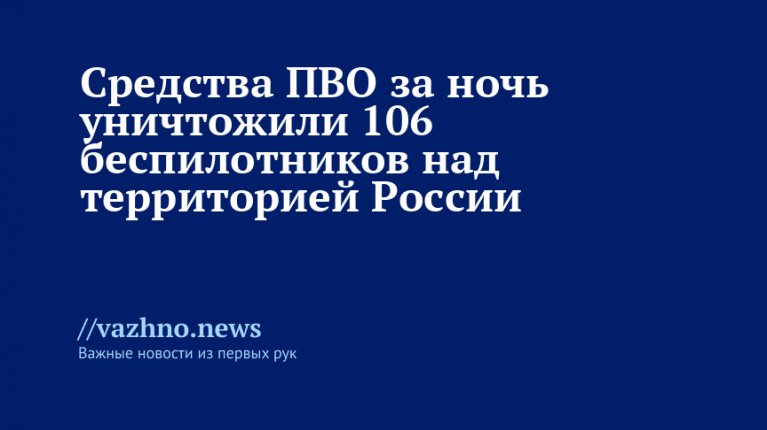 «В течение прошедшей ночи дежурными средствами ПВО перехвачены и уничтожены 106 украинских беспилотных летательных аппаратов самолетного типа», — говорится в сообщении в Telegram-канале.