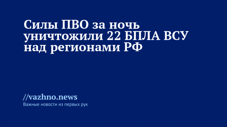 «На протяжении прошедшей ночи средства ПВО, находившиеся на дежурстве, осуществили перехват и уничтожение двадцати двух украинских беспилотников самолетного типа», — указано в публикации Telegram-канала военного ведомства.