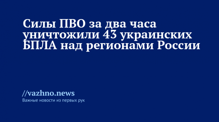 «Дежурными средствами ПВО перехвачены и уничтожены 43 украинских беспилотных летательных аппарата самолетного типа», — говорится в официальном заявлении.
